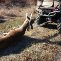 Not everything is perfect though. We did run into one drawback. Depending on the terrain you are towing the deer over, you will loose some fur. In the case of the large doe, it was drug quite a ways over frozen dry dirt lanes. It did wear away patches of fur but not in front of the shoulders since it does hold enough of the head and neck off the ground. If you are dragging thru woods or over grassy areas, I don’t see a problem. Another little thing I would like to see would be a two piece design. They built this very well and I see it lasting forever. But it does take up some room in storage.